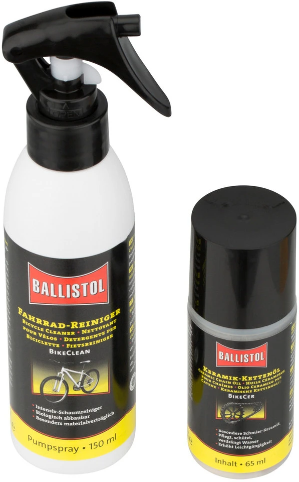 Mit dem Fahrradpflege-Set von Ballistol reinigst Du Dein Bike und schmierst und pflegst Deine Kette und die übrigen Antriebskomponenten.