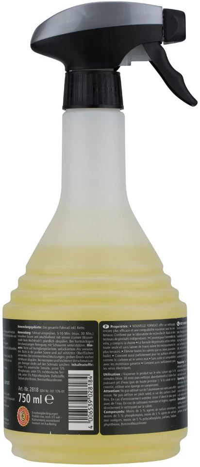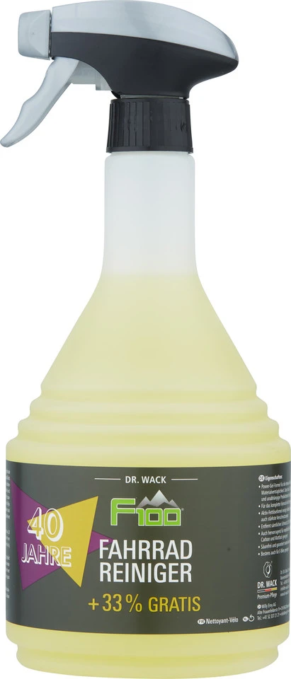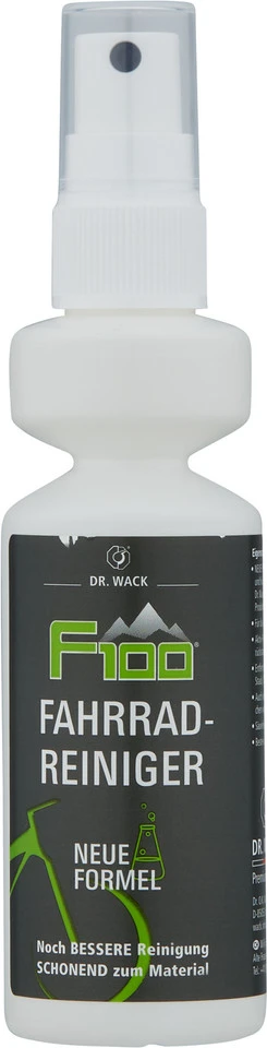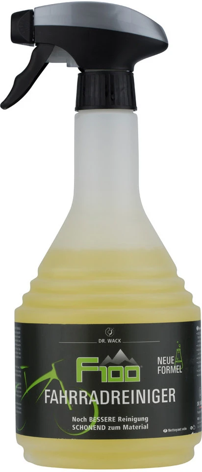 Spezifikationen:Bezeichnung:F100 FahrradreinigerAnwendungsbereich:Reinigung des FahrradsFeatures:für das ganze Fahrrad inklusive Kette geeignetentfernt stärkste Verschmutzungen dank Aktiv-Fettlöseformelreinigt selbstständig und rückstandsfreischützt empfindliche Oberflächen (z. B. Alu, Chrom, Carbon, eloxierte Teile)auch für Mattlack geeignetsäurefrei und materialverträglichfür E-Bikes geeignetAnwendung:komplettes Fahrrad einsprühen5-10 Minuten (bei starken Verschmutzungen 30 Minuten) einwirken lassenanschließend mit Wasserstrahl (kein Hochdruck!) gründlich abspülen, bis keine Schaumbildung mehr sichtbar istbei Bedarf Reinigung mit Schwamm oder Bürste unterstützen