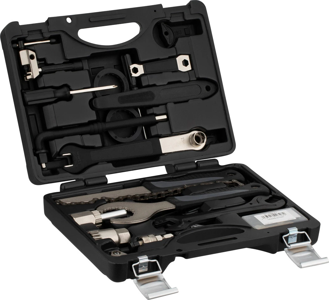 Kette / Kassette: Kettennieter, Kettenpeitsche, Kassettenabzieher für Schnellspanner und Steckachse, auch passend für Center-Lock-Bremsscheiben bei SchnellspannnabenKurbel / Innenlager: Schlüssel für Hollowtech II Kurbelschrauben, Innenlagerabzieher, Innenlagerschlüssel, auch passend für Center-Lock-Bremsscheiben bei Steckachsnaben, Shimano SM-BBR60 Adapter, Shimano SM-BB9000 BB93 Adapter, Kurbelabzieher, Kettenblatt-SchraubenschlüsselReifen / Laufrad: Reifenheber (Paar), Flickset, Ventilschlüssel AV und SV, Speichenschlüssel für 3,2 mm (0.127“) Nippel, Speichenschlüssel für 3,3 mm (0.130“) Nippel, Speichenschlüssel für 3,4 mm (0.136“) NippelPedal / Nabe: Pedalschlüssel, Konusschlüssel 13 mm, Konusschlüssel 14 mm, Konusschlüssel 15 mm, Konusschlüssel 16 mmSchraubwerkzeuge: Schraubendreher mit Wechselklinge: flach 5 mm / Phillips, Schraubendreher 3 mm, Innensechskant 2 mm / 2,5 mm / 3 mm / 4 mm / 5 mm / 6 mm / 8 mm, Torx T10 / T15 / T20 / T25 / T30 / T40 / T45 / T50Weitere Informationen zum Werkzeugkoffer
