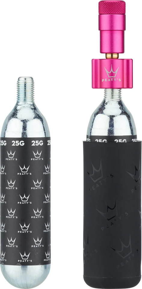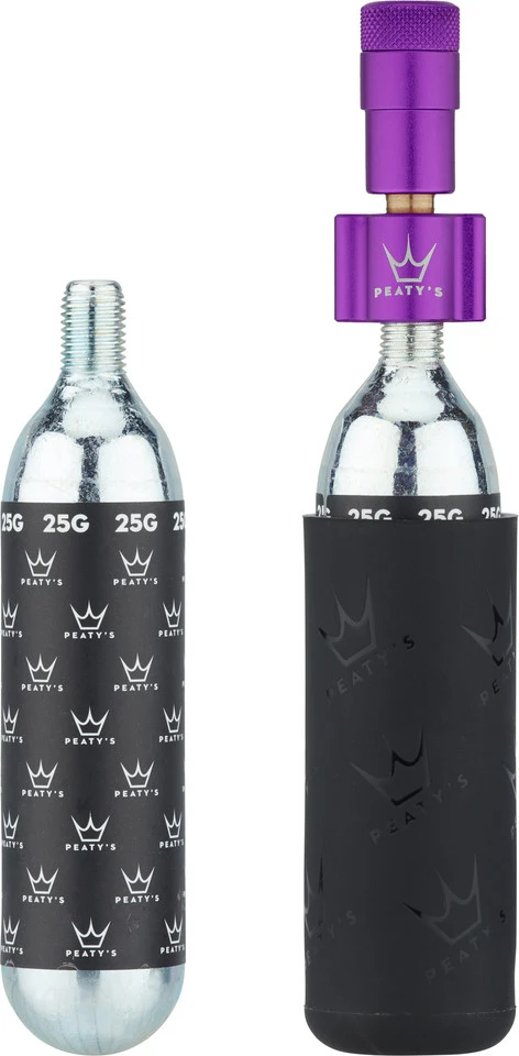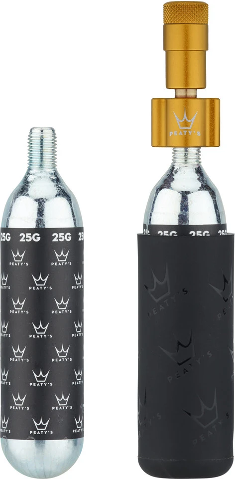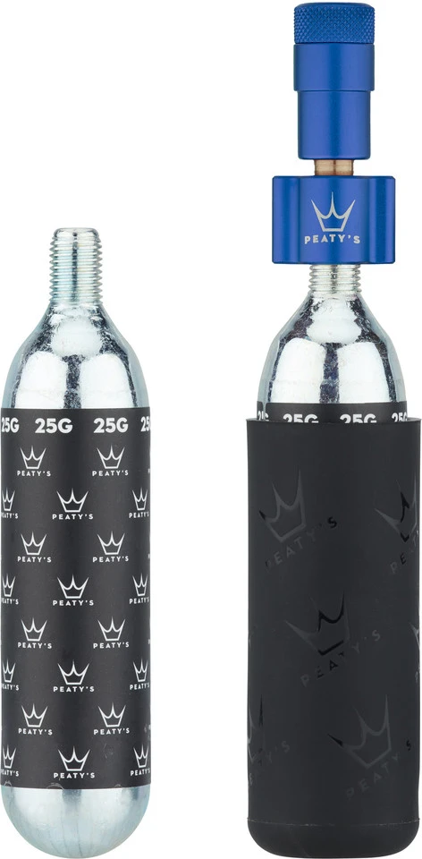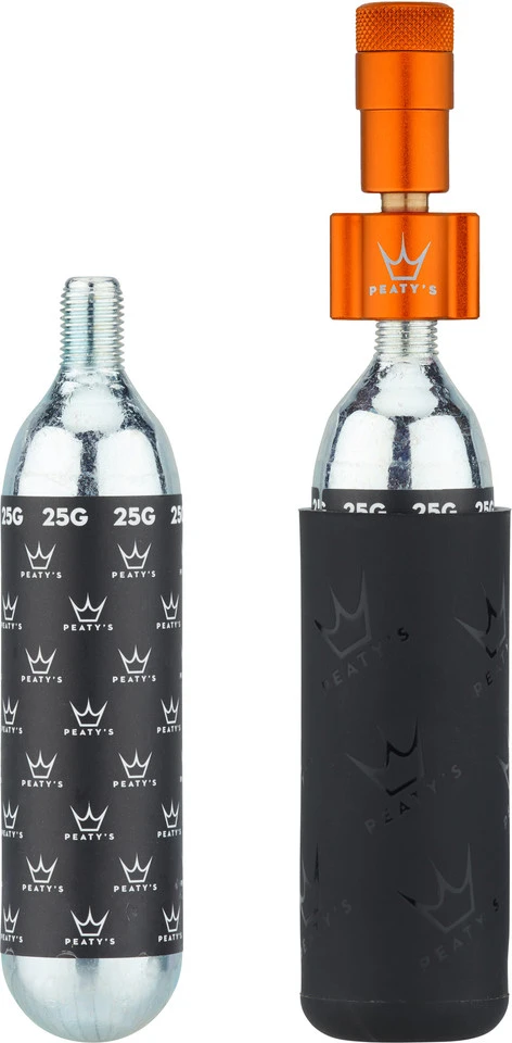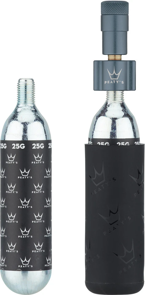 Lieferumfang:1 x Kartuschenpumpe Peaty’s Holeshot CO2 Tyre Inflator2 x CO2-Kartusche Peaty’s Holeshot CO2 Cartridge 25 g1 x Silikonhülle Peaty‘s