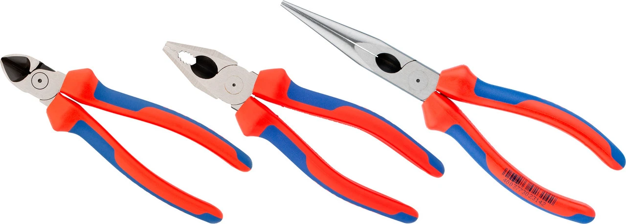 Das Zangenset Montage-Paket von Knipex besteht aus einer Kombizange, einem Seitenschneider und einer Flachrundzange mit Schneide.