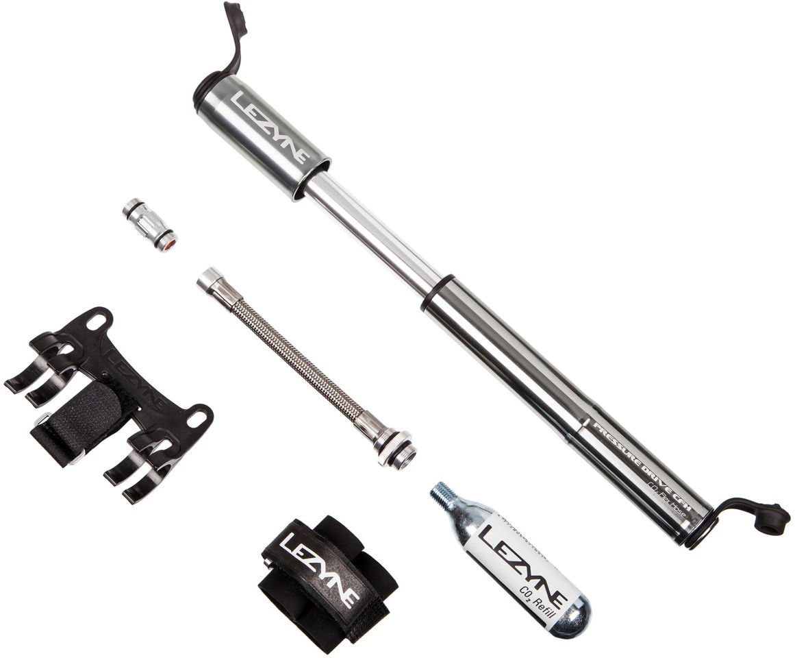 Lieferumfang:1 x Pumpe Lezyne Pressure Drive CFH1 x Pumpenhalterung Lezyne1 x CO2-Kartusche Lezyne 16 g