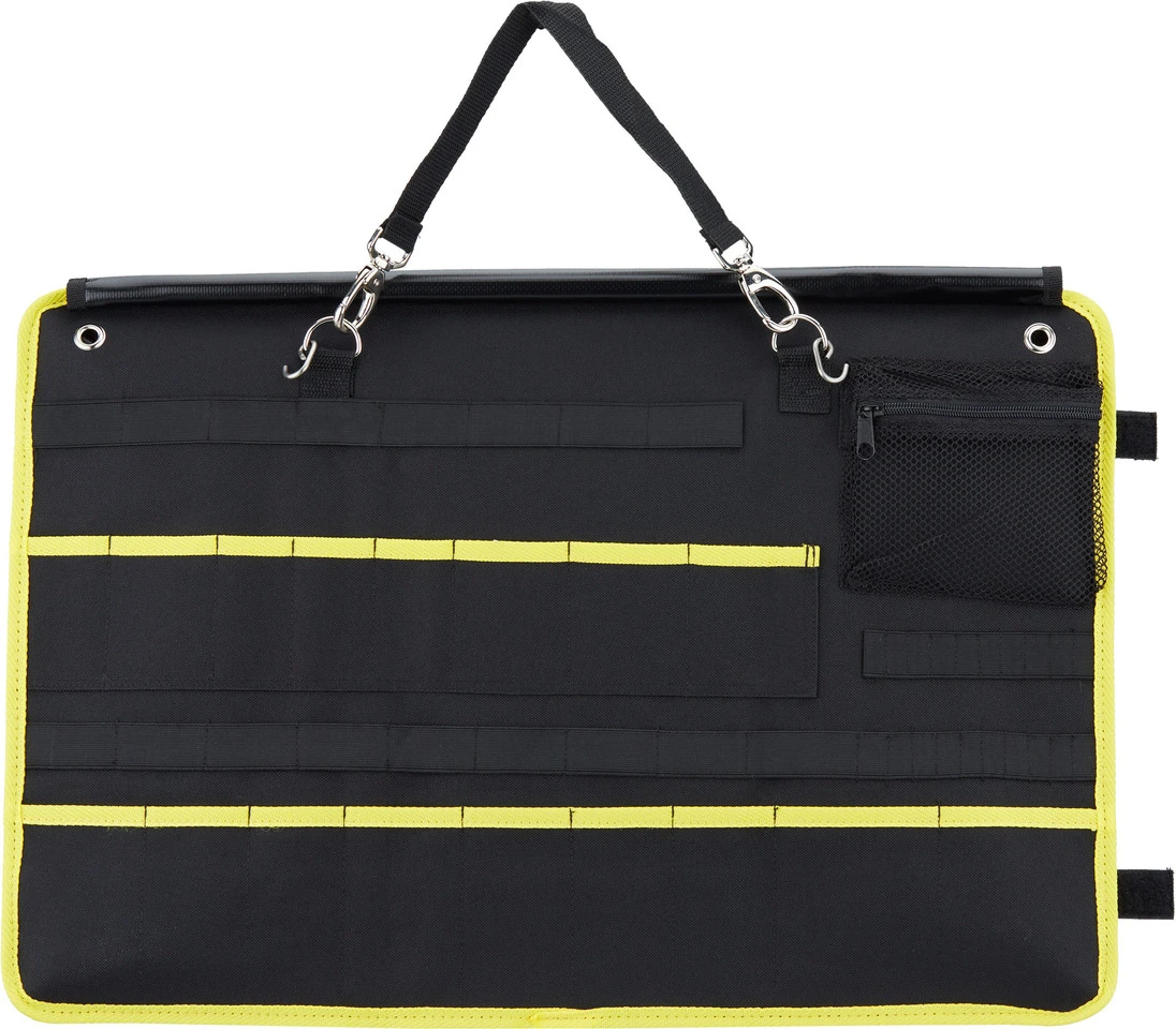 Spezifikationen:Größe:60 x 40 cm (ausgerollt)Features:kompaktes Design ideal für Transport und Reisenkann befüllt zusammengefaltet werdenviele Fächer für Werkzeuge in verschiedenen Größengroße Netztasche mit Reißverschluss8 kleine Fächer passend für Bitselastische Schlaufen zum Fixieren von Werkzeugenaus wasserfestem, widerstandsfähigem Material hergestelltX-Frame-System macht die Tasche zu einer festen WerkzeugpaletteHerstellernummer:6450696