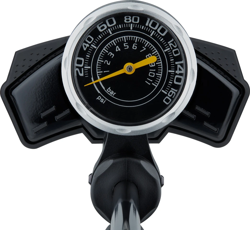 Die 3min19sec Standpumpe ist eine robuste Pumpe aus Stahl, die einen Druck von bis zu 11 bar erzeugt. Der intuitiv bedienbare Ventilkopf kann sowohl auf Presta-, wie auf Schrader- wie auf Dunlop-Ventilen verwendet werden. Ein gummierter T-Griff sorgt für Komfort und guten Halt beim Pumpen, während der breite Fuß einen sicheren Stand gewährleistet. Außerdem hilft ein oben angebrachtes, 60 mm großes und gut ablesbares Manometer dabei, den richtigen Druck zu erzielen.