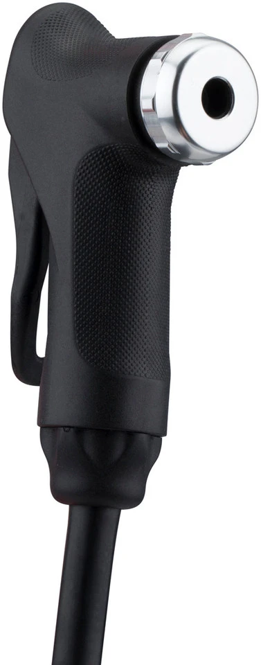Der SwitchHitter II Pumpenkopf arbeitet mit einem internen Gummiring, welcher sich automatisch an die Form des Ventils anpasst, sodass er mit Presta-/SV- und Schrader-/AV-Ventilen gleichermaßen kompatibel ist. Dazu musst Du den Pumpenkopf mit horizontal ausgerichtetem (= geöffnetem) Hebel über das Ventil stülpen und schnell über den Deflationspunkt hinaus bis zum Einrasten hinunterdrücken. Ziehst Du nun am Hebel und bringst ihn in die vertikale Position, schließt sich der Mechanismus, der eingebaute Gummiring wird komprimiert und adaptiert sich ans jeweilige Ventil. Nach Beendigung des Pumpvorgangs muss der Hebel wieder geöffnet und der Pumpenkopf schnell abgezogen werden.