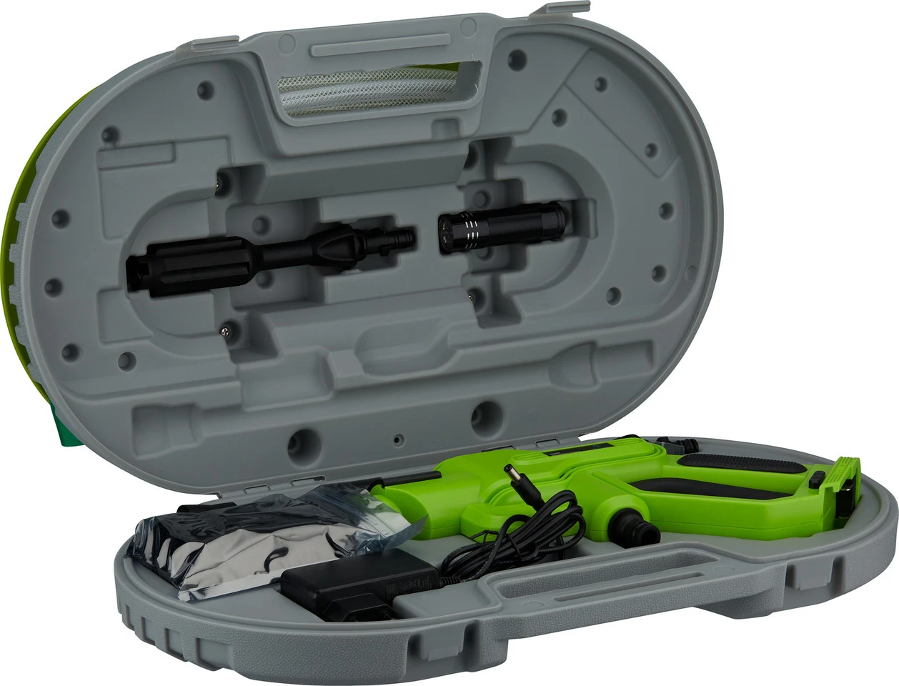 Technische Daten:Wasserdruck:14 – 20 barMaße (HxBxT):83 mm x 458 mm x 208 mmSpannung Akku:20 VSchlauchlänge:5 mFeatures:leichter, tragbarer Druckreiniger mit zwei kombinierbaren Aufsätzen (Düsenkopf und Sprühlanze)Düsenkopf zum Einstellen des Sprühstrahls in zwei Stufen: Sprühnebel oder WasserstrahlSprühlanze für schwer zu erreichende Stellen5 Meter langer Schlauch für die Wasserversorgung aus einer beliebigen Quelle, vom Wassereimer bis zum Bachlaufbis zu 25 Minuten Dauerreinigung und 3,5 Liter pro Minute Maximalsprühleistungaufsteckbare Leuchte für Einsatz bei schwierigen Lichtverhältnissenabnehmbarer Li-Ion-Akku (2500 mAh); Aufladung über separates Netzteil (Ladezeit 3,5 bis 4 Stunden)energiesparend und umweltfreundlichmit kompaktem TransportkofferHinweis des Herstellers:Nur mit Filter nutzen. Druckreiniger nicht bei Temperaturen unter 0 °C aufbewahren.