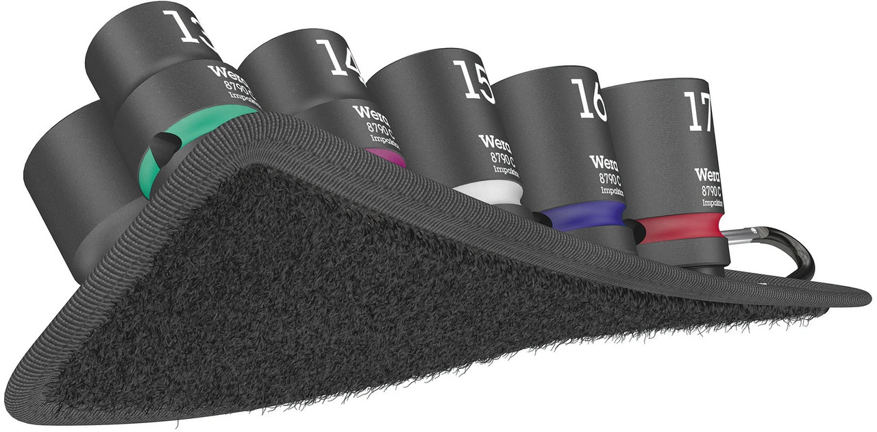 Der Belt C Impraktor 1 Steckschlüsseleinsatz-Satz von Wera besteht aus einem robusten Textilgurt und für den Schlagschrauber-Einsatz geeigneten Nüssen. Diese halten auch den härtesten Bedingungen stand. Jede Nuss wurde dem „Take it easy“-Werkzeugfinder, einer farbigen Kennzeichnung, versehen. So findest Du blitzschnell die richtige Nussgröße für Dein Vorhaben. An der Rückseite des Gurtes befindet sich Vlies, dieses hält sehr gut am selbstklebenden Klettstreifen. Diesen kannst Du beispielsweise an der Wand oder einem Regal anbringen. So hat der Belt C Impraktor 1 einen festen Platz in Deiner Werkstatt. Wenn Du ihn jedoch außerhalb der Werkstatt benötigst, kannst Du ihn mit Hilfe des Karabinerhakens an Deiner Hose oder an einer Tasche befestigen.