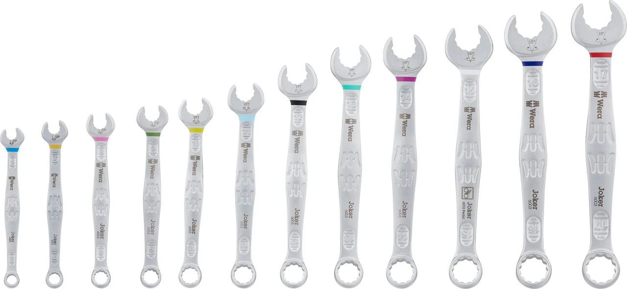 4 x Ringmaulschlüssel Wera Joker 6003 (6, 7, 8, 9, 10, 11, 12, 13, 14, 16, 17)1 x Ringmaulschlüssel Wera Joker 6003 Pedal (15)1 x Klettstreifen Wera1 x Falttasche Wera