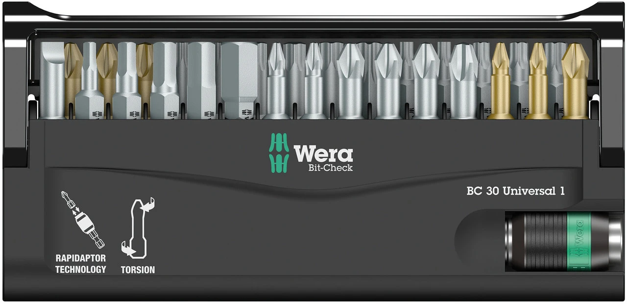 Spezifikationen Bits:Anwendung:Kreuzschlitz-Phillips-Recess-, Phillips-Pozidriv-, Torx-, Innensechskant- und SchlitzschraubenAntrieb:1/4″ -Sechskant, passend für Halter nach DIN 3126-D 6,3, ISO 1173Ausführung:Torsionsform gegen frühzeitigen Verschleiß, zähhart, besonders geeignet für den harten Schraubfall z. B. in Blech oder MetallSpezifikationen Rapidaptor:Anwendung:Geeignet für Bits mit 1/4“-Außensechskantantrieb nach DIN 3126-C 6,3 und E 6,3 (ISO 1173) und Wera Anschluss-Reihen 1 und 4Antrieb:1/4″ -Sechskant, passend für Schraubermaschinen mit Aufnahme nach DIN 3126-F 6,3, ISO 1173Ausführung:Rapidaptor-Technologie mit rapid-in, rapid-out, rapid-spin, chuck-all und single-hand-Funktion, mit starkem DauermagnetFeatures:Die Bit-Entnahme ist mit dem einhändig zu bedienenden Öffnungsmechanismus äußerst komfortabel. Durch Betätigen des Schiebeschalters öffnet sich der Bit-Check automatisch, Bits und Halter können leicht entnommen werden.Die verwendeten Kunststoffe garantieren hohe Robustheit und lange Lebensdauer.Die Sortierung nach Abtrieben und Größen ermöglicht einen schnellen Zugriff auf die Bits. Das macht die Arbeit schneller und einfacher.Torsion: Bei der Torsionstechnik werden Drehmomentspitzen in der Torsionszone des Bits abgefedert. Das vermeidet vorzeitigen Verschleiß und führt zu einer deutlich erhöhten Lebensdauer des Werkzeugs.Technologien:Rapidaptor: Das kompakte Funktionswunder